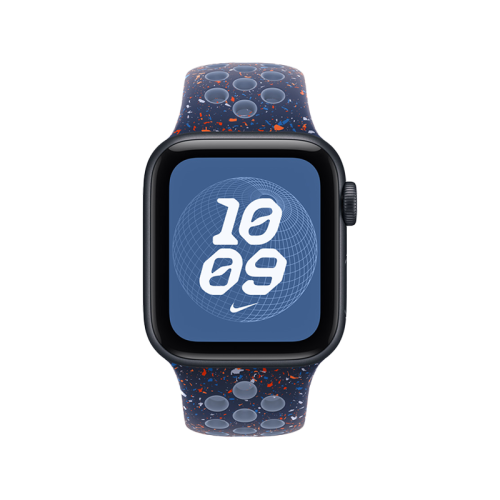 Made with compression-molded perforations for breathability, the Nike Sport Band is durable and strong, yet surprisingly soft. It features colorful flakes that create a randomized pattern, making each band unique. The smooth, dense material drapes elegantly across your wrist and feels comfortable next to your skin. An aluminum pin-and-tuck closure — carefully etched with the Run Swoosh logo — gives the pin a fresh matte finish.