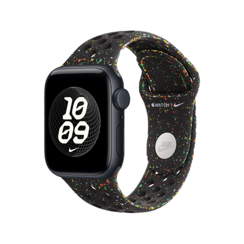 Made with compression-molded perforations for breathability, the Nike Sport Band is durable and strong, yet surprisingly soft. It features colorful flakes that create a randomized pattern, making each band unique. The smooth, dense material drapes elegantly across your wrist and feels comfortable next to your skin. An aluminum pin-and-tuck closure — carefully etched with the Run Swoosh logo — gives the pin a fresh matte finish.