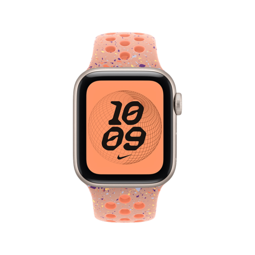 Made with compression-molded perforations for breathability, the Nike Sport Band is durable and strong, yet surprisingly soft. It features colorful flakes that create a randomized pattern, making each band unique. The smooth, dense material drapes elegantly across your wrist and feels comfortable next to your skin. An aluminum pin-and-tuck closure — carefully etched with the Run Swoosh logo — gives the pin a fresh matte finish.