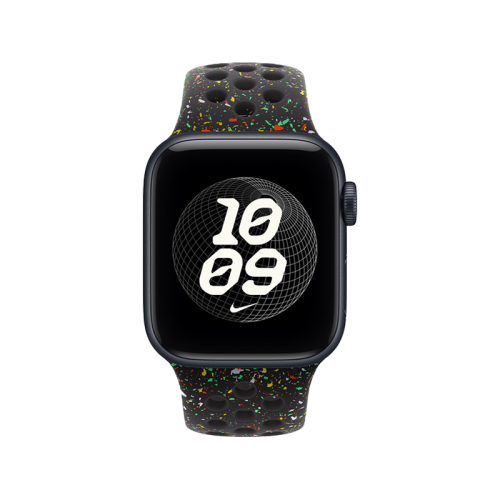 Made with compression-molded perforations for breathability, the Nike Sport Band is durable and strong, yet surprisingly soft. It features colorful flakes that create a randomized pattern, making each band unique. The smooth, dense material drapes elegantly across your wrist and feels comfortable next to your skin. An aluminum pin-and-tuck closure — carefully etched with the Run Swoosh logo — gives the pin a fresh matte finish.