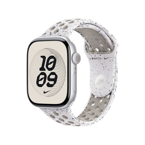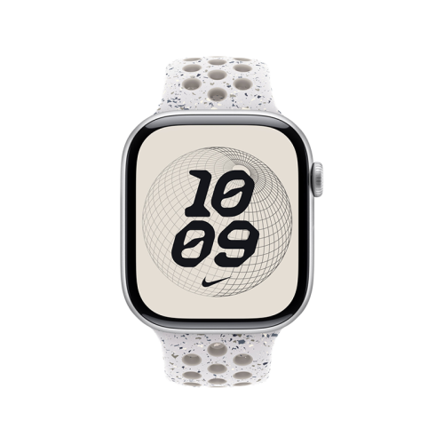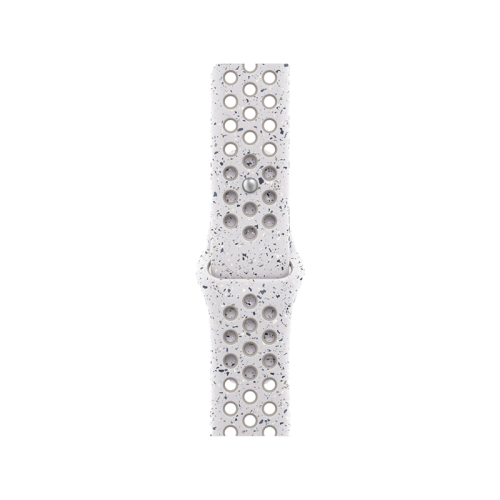 Made with compression-molded perforations for breathability, the Nike Sport Band is durable and strong, yet surprisingly soft. It features colorful flakes that create a randomized pattern, making each band unique. The smooth, dense material drapes elegantly across your wrist and feels comfortable next to your skin. An aluminum pin-and-tuck closure — carefully etched with the Run Swoosh logo — gives the pin a fresh matte finish.