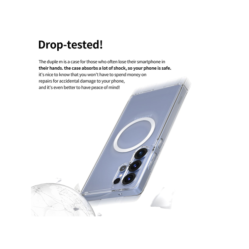 The Araree Duple MagSafe Case for the Galaxy S25 Ultra is a clear, dual-layer case with MagSafe technology. It offers military-grade shock protection, raised edges for screen and camera lens protection, and a lightweight design.