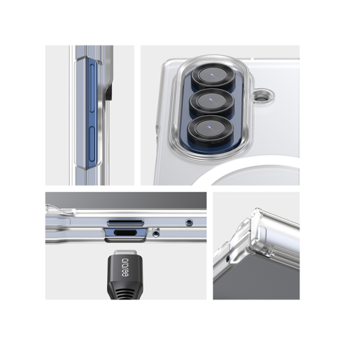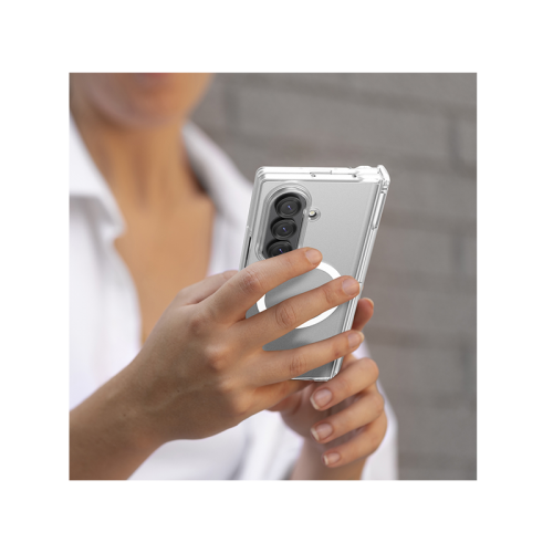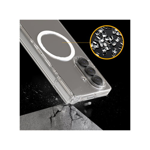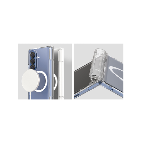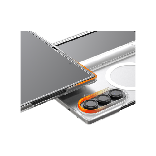 A crystal-clear, ultra-slim case built for full-body protection and MagSafe convenience. It features durable polycarbonate, 360° hinge coverage, and built-in magnets for seamless wireless charging. Designed to resist yellowing and scratches, it includes anti-rainbow dot matrix tech for visual clarity and a lay-flat structure for stable use on surfaces—all while showcasing the Fold 7’s sleek design.