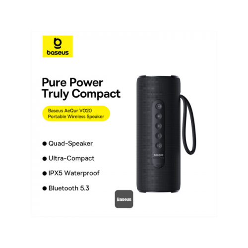 The Baseus AeQur VO20 wireless speaker is equipped with 4 drivers and delivers an impressive 15W of power, ensuring amazing music experiences. It supports a reliable Bluetooth 5.3 wireless connection and has IPX5 waterproofing, so you can take it with you almost anywhere - even to the beach or pool. It is also distinguished by its colorful backlight with 8 selectable lighting modes.