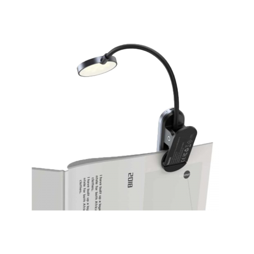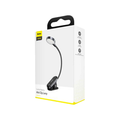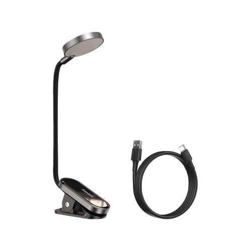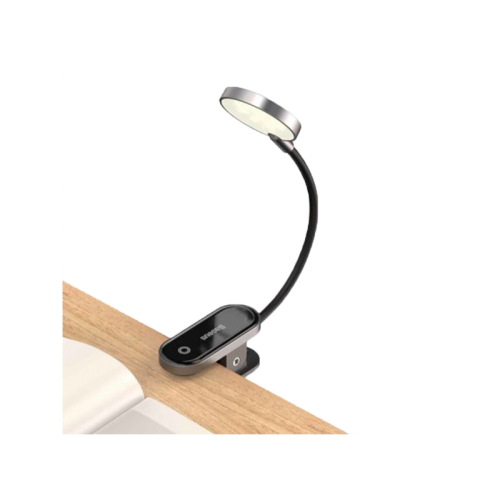 The Baseus Comfort Reading Mini Clip Lamp - Dark Grey offers three adjustable brightness levels, a large light transmission area for uniform brightness, comfortable and natural lighting, a built-in rechargeable battery with long life, and a flexible gooseneck design for easy positioning.