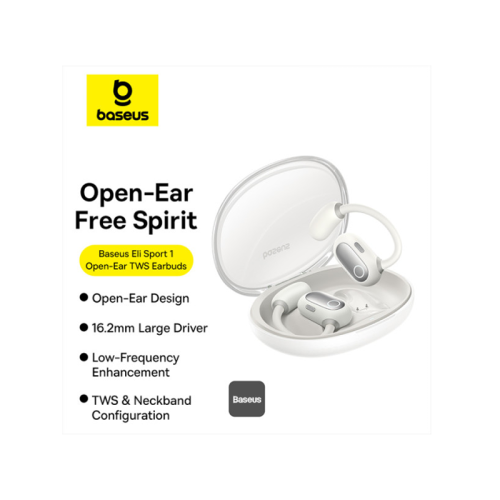 The Baseus Eli Sport 1 Open-Ear Wireless Earphones feature open-ear design, 16.2mm drivers, Bluetooth 5.3, IPX4 waterproof rating, 30-hour battery life, and fluorescent ear hooks for visibility. Perfect for active use and clear audio.