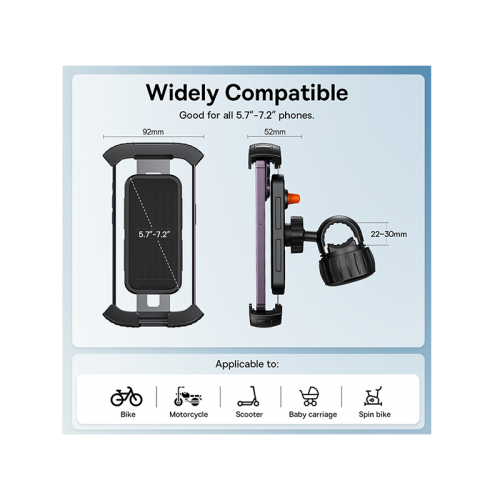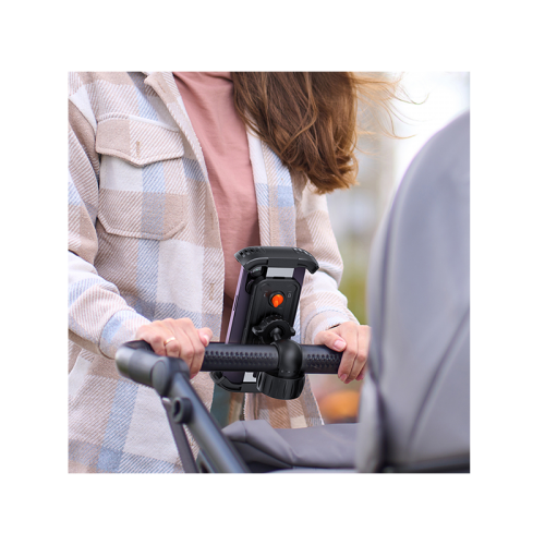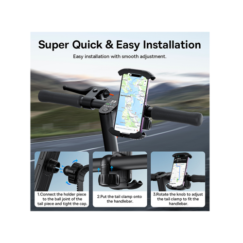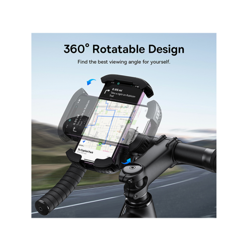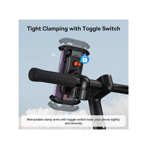 The Baseus Quick Go Series Bike Phone Mount - Cluster Black offers 360-degree rotation, retractable arms for secure phone holding, toggle switch for stability, and compatibility with various vehicles like bikes, scooters, and motorcycles.