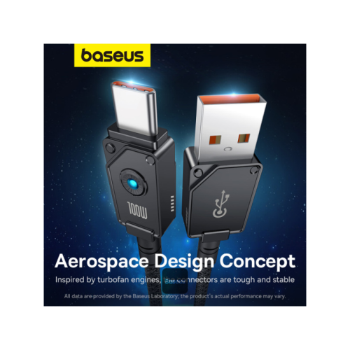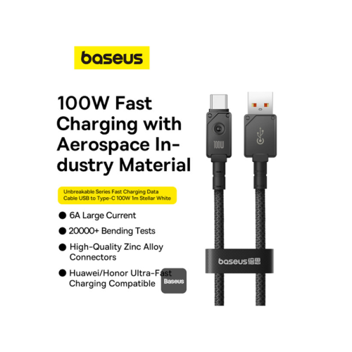 The Baseus Unbreakable Series USB-A to USB-C 100W Fast Charging Cable features 100W fast charging, 480Mbps data transfer, military-grade aramid fiber braiding, smart chip protection, and zinc alloy connectors. It's perfect for high-speed charging and data syncing.