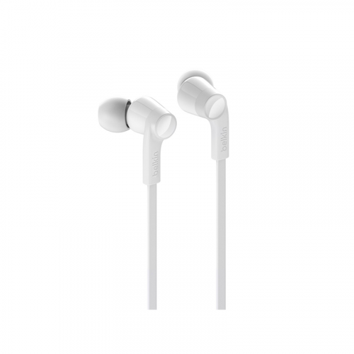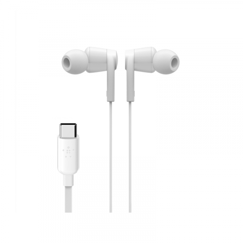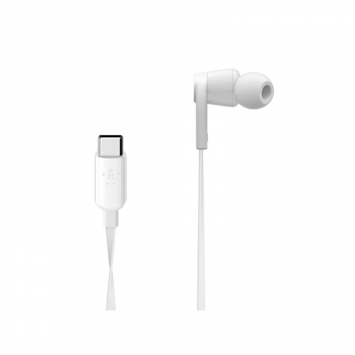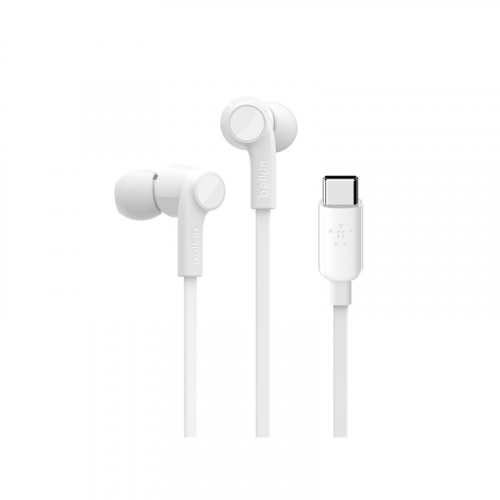 The Belkin Headphones with USB-C Connector in White are wired earbuds designed for high-quality audio and comfort. They feature a durable, tangle-free cable, a built-in microphone, and come with multiple ear tip sizes for a secure fit. These earbuds are sweat and splash resistant (IPX5-rated) and deliver Belkin's signature sound.