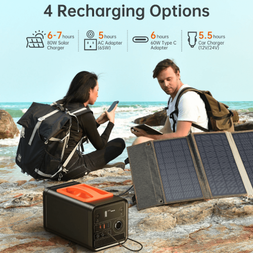 • ECO-Friendly Power Supply: The environmentally friendly power machine features pure sine-wave technology that safely powers electronic devices by providing clean, stable electricity that is just as dependable and safe as the power you get at home. Gas-free and can be easily charged by a solar panel, providing and storing free and green energy. Runs quiet without any exhaust fumes. (The cooling fan on the side of the generator will make a slight sound when working)Efficient Solar Generator: This power station can be charged in multiple ways: the battery can be fully recharged with a 100W Solar Panel (Not included); by being plugged into the AC wall outlet; with a 60W PD Charger and it can also be recharged by plugging into your car 12V socket (Car Charger included). You can take this power station as an emergency/backup power supply for your phone, small fan, laptop, radio etc.