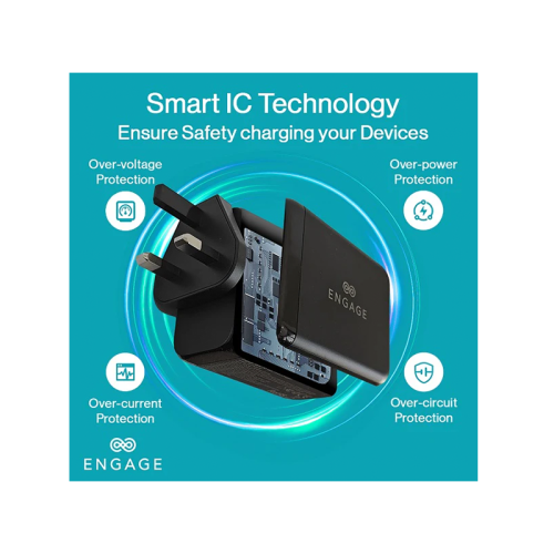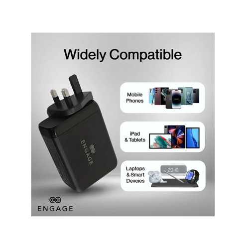 The Engage 3 Port USB-C + 1 Port USB-A 200W GaN Travel Charger in Black is a powerful and efficient charging solution. It features three USB-C ports and one USB-A port, delivering a total of 200W of power. This charger is ideal for charging laptops, tablets, and other high-power devices on the go.