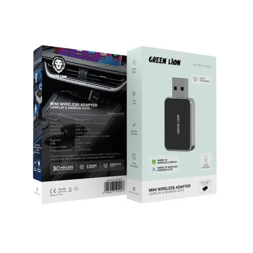The Green Lion Mini Wireless Adapter CarPlay & Android Auto - Black is a small and very effective device with which the car’s infotainment system can be upgraded. This adapter, powered by the Allwinner V821 chipset, provides flawless compatibility with CarPlay (iOS 10 and later) and Android Auto (Android 11 and later), making it possible to use wireless connections instead of wired ones. With Bluetooth V5.2 and dual-band Wi-Fi (2.4GHz + 5GHz), stable, high-speed streaming and audio connectivity are there for you. The adapter has an elegant mixture of aluminum alloy and glossy acrylic for strength and aesthetic appeal. Besides, USB-C and USB-A interfaces are there not only for charging but also for connecting various vehicles and devices. Installation is simple and quick due to the plug & play feature, which means you will not spend much time setting up. Besides the support of wireless voice assistants, audio streaming, and an overall better driving experience, the Green Lion Mini Wireless Adapter is already there to connect you more easily and upgrade your connection to your car system.