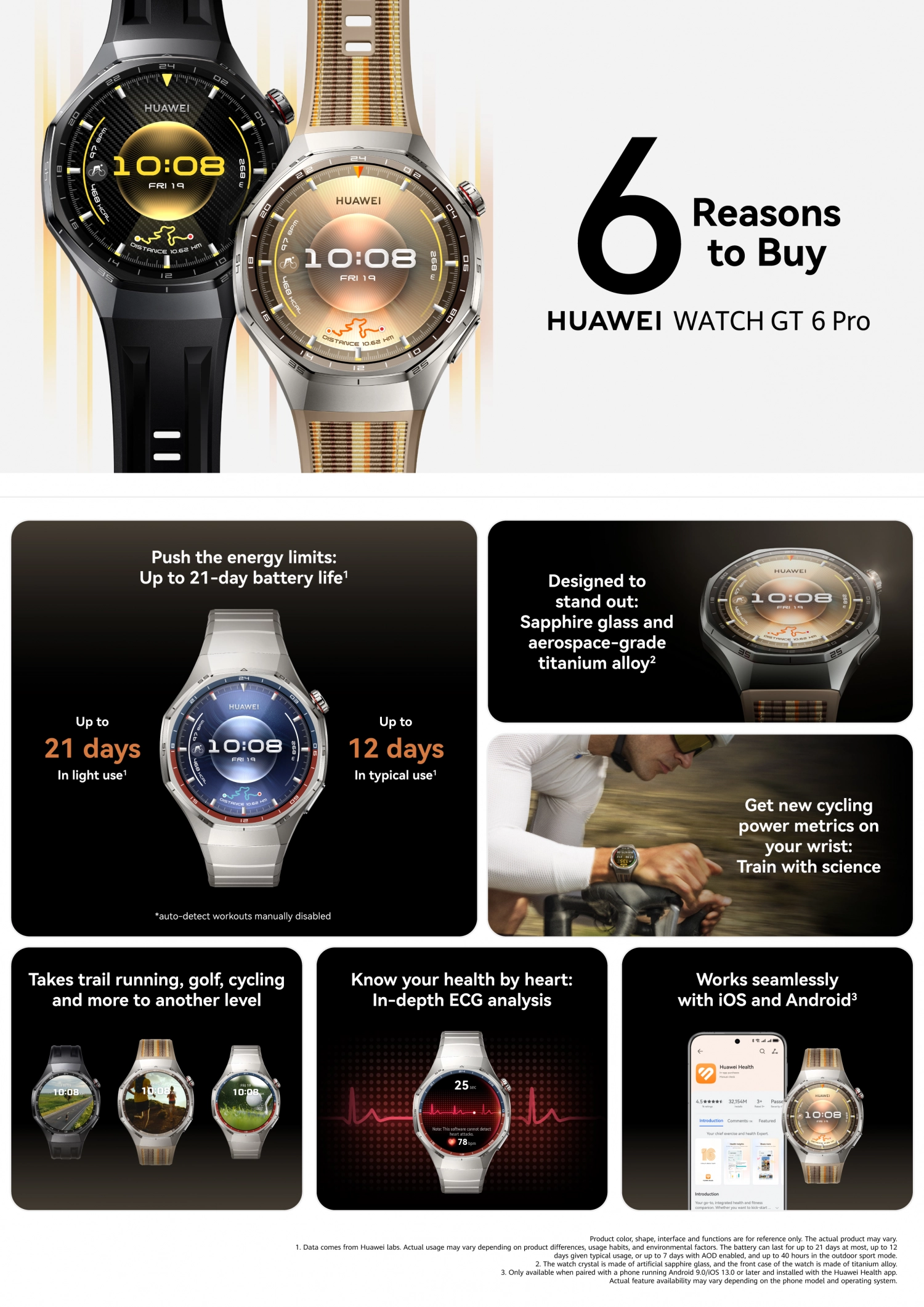 The Huawei Watch 6 Pro is a premium smartwatch built for both everyday use and professional fitness. They feature a 1.47" AMOLED display, titanium or stainless steel casing, and up to 50-meter water resistance. Key highlights include advanced workout modes (running, cycling, swimming, and triathlon), dual-band GPS, AI running plans, and RouteDraw navigation. The Atum Pro adds exclusive features like ECG monitoring, golf course mode, contour maps, and 40-meter free diving support. Both models offer health tracking (heart rate, SpO2, sleep, stress, and ovarian health), Bluetooth calling, NFC payments, offline music (Android only), and over 10,000 customizable watch faces. Compatible with Android and iOS, though some features are Android-exclusive.