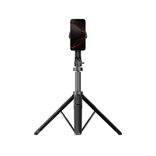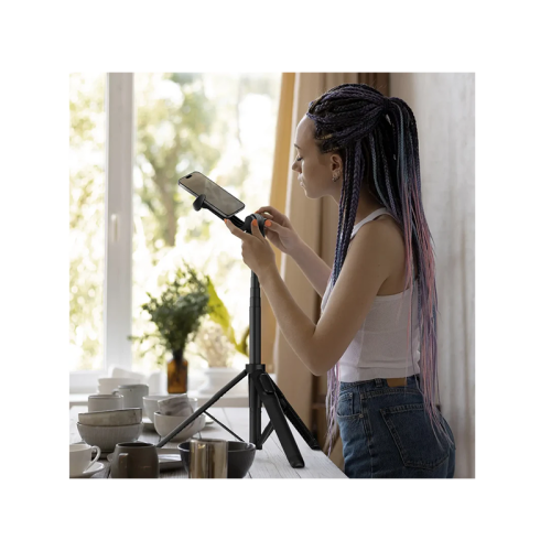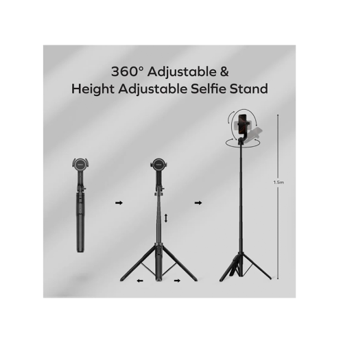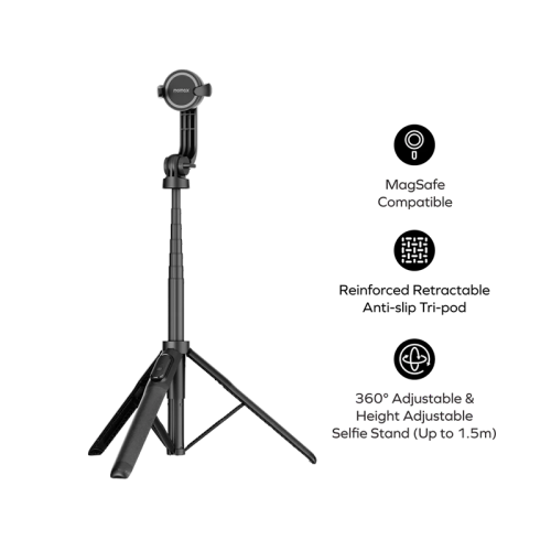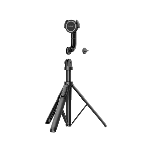 The Momax 1-Snap Pole selfie stick doubles as a tripod, offering easy setup with attachment provisions for iPhone and Android devices, adjustable height, flexible angles, and a detachable remote control for wireless snapping.