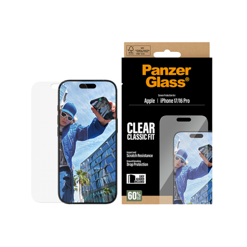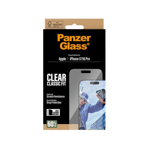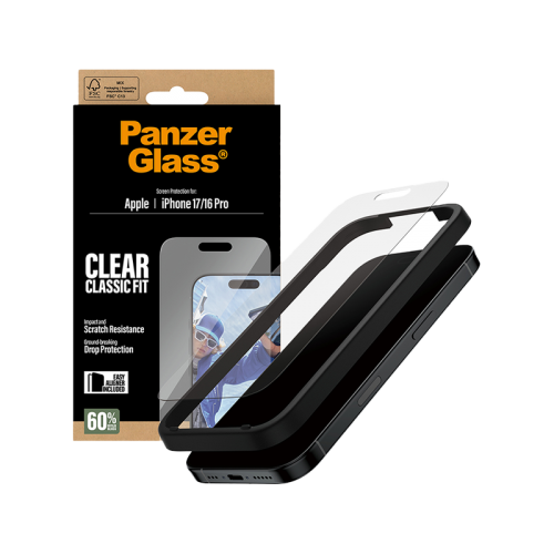 The PanzerGlass® Classic Fit screen protector offers tough, eco-friendly protection for your phone screen, made from 60% recycled glass and designed to resist scratches, shocks, and drops. It features a smudge-free coating to keep your screen clear and includes an EasyAligner made of 100% recycled plastic for easy installation, along with step-by-step instructions and a video guide. Covering only the active screen area, it helps extend your phone’s life and supports sustainability with reduced packaging and recyclable materials. For full protection, it pairs well with PanzerGlass® cases and camera lens protectors.