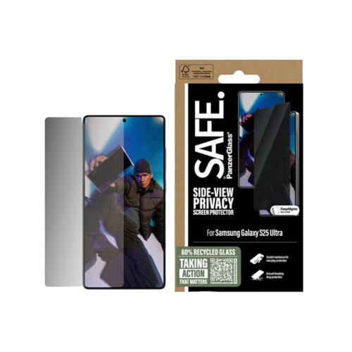 The Panzer Glass Safe Ultra Wide Fit Privacy Screen Protector for Samsung Galaxy S25 Ultra offers durable edge-to-edge protection with privacy functionality, making screen content invisible to bystanders. It is made from tempered glass, repels fingerprints and smudges with an oleophobic coating, and fits perfectly with phone cases. The easy installation process includes the use of an Easy Aligner.