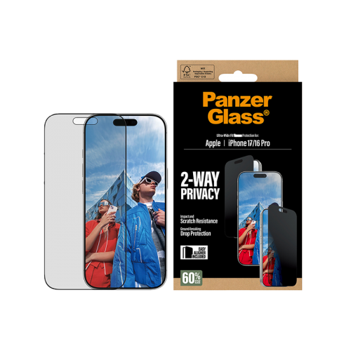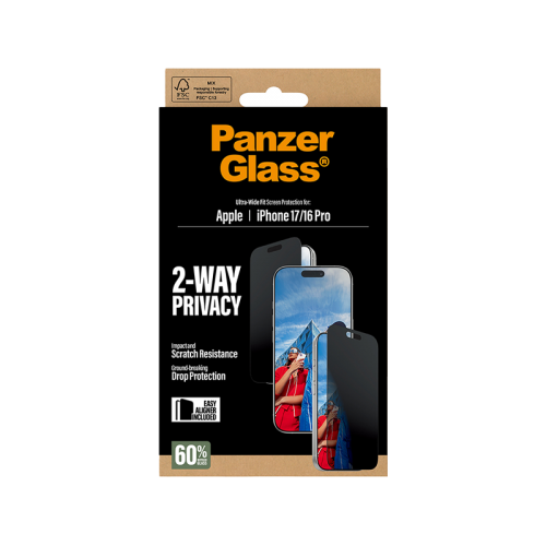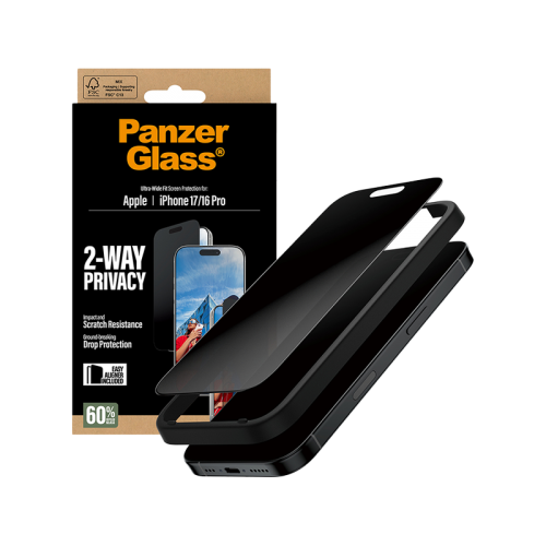 The PanzerGlass® Ultra-Wide Fit privacy screen protector combines powerful protection with personal privacy, using a 60% recycled glass design and a privacy filter that keeps your screen content visible only to you. It resists scratches, drops, and smudges while helping extend your phone’s lifespan. Easy to install with a 100% recycled EasyAligner and step-by-step guidance, it also supports sustainability through reduced packaging and recyclable materials. Designed to cover the full front surface of your phone.