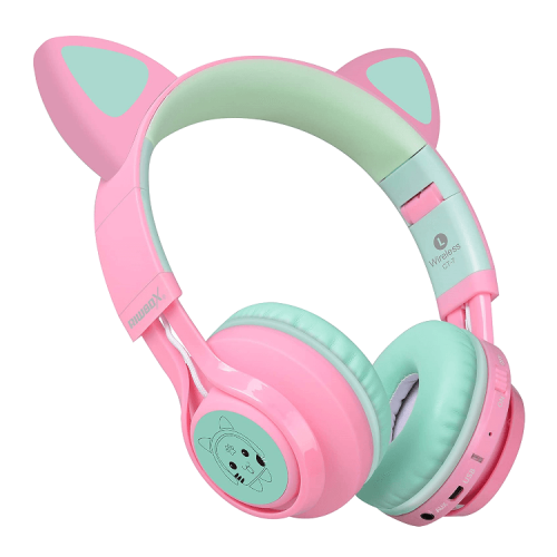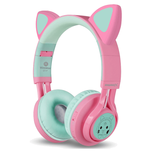 The Riwbox Cat Ear Bluetooth Headphones With LED for Kids in pink/green are fun, foldable Bluetooth headphones featuring cat ear-shaped LED lights, volume control, and a built-in microphone for calls and online learning.