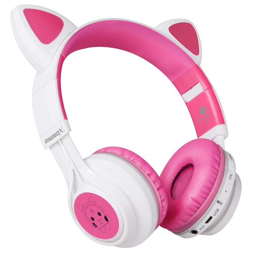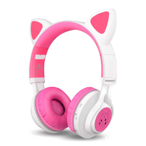 The Riwbox Cat Ear Bluetooth Headphones With LED for Kids in white/pink are foldable wireless headphones with fun, cat ear-shaped LED lights, providing a playful design, volume control, and a built-in microphone for calls and online learning.