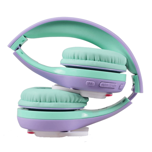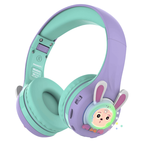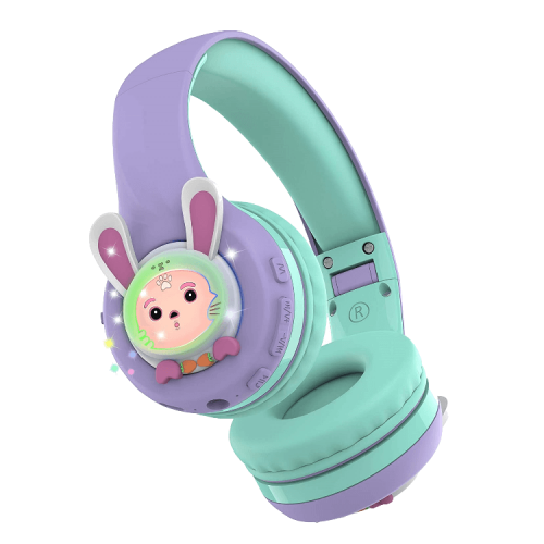 The Riwbox Rabbit Bluetooth Headphones With LED for Kids in purple/green are foldable wireless headphones with LED lights, offering fun and colorful designs, volume control, and a built-in microphone for calls.