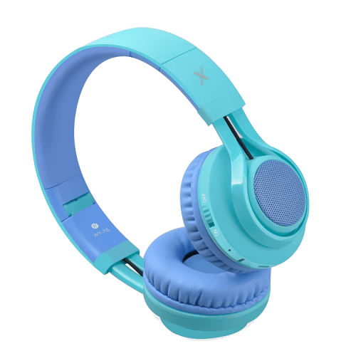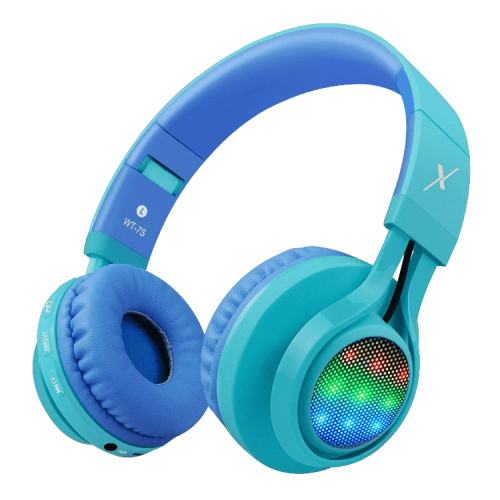 The Riwbox Wireless Headphones With LED for Kids in blue/green are fun, foldable Bluetooth headphones with colorful LED lights, providing volume control, a built-in microphone, and a comfortable design for kids.