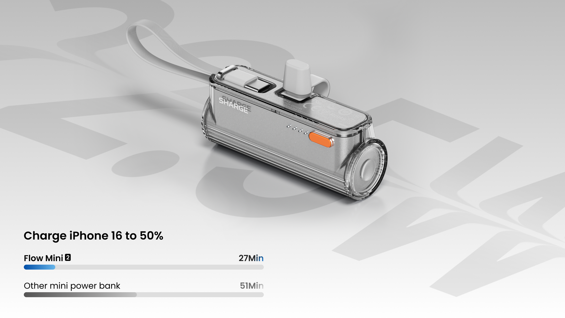 Charge with Phone Case on. Works with phone cases up to 0.15 inches thick. | Pass-through Charging. Refill Flow Mini 2 and juice up your devices all at once. | Crisp Power Indicator. Get informed of the remaining battery with just a glance. |