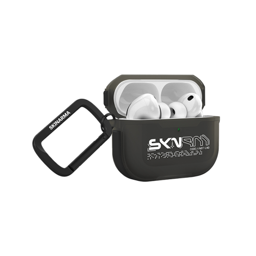 Protective designer case made for your AirPods Pro 3, featuring a semi-clear outer shield, metallic detailing, and a customised SKRM hook carabiner.