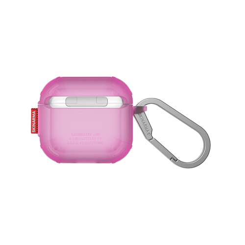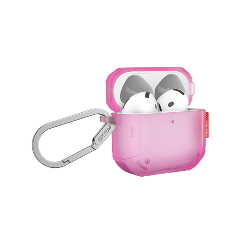 The SkinArma Mecha CE Case for AirPods 4 - Pink is a protective case featuring a sleek, minimalist design with a secure magnetic locking mechanism and a custom SKRM hook carabiner.