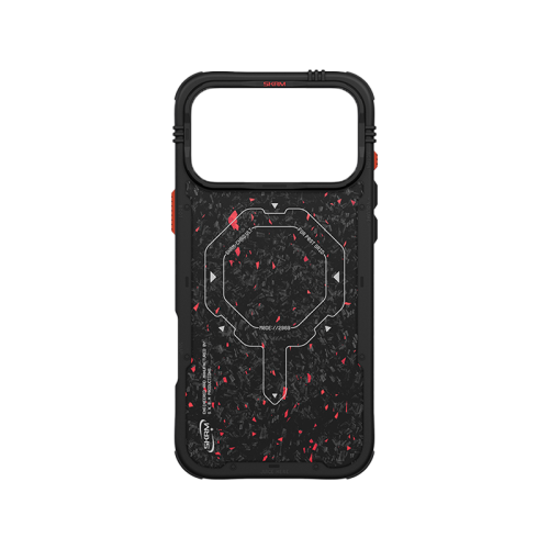 On target with VEKTOR. Ultra protective case designed with a forged carbon back completed with red specks, featuring a magnetic ring module designed for wireless charging. Customisable with interchangeable corner bumper lanyard loops to sling it on.