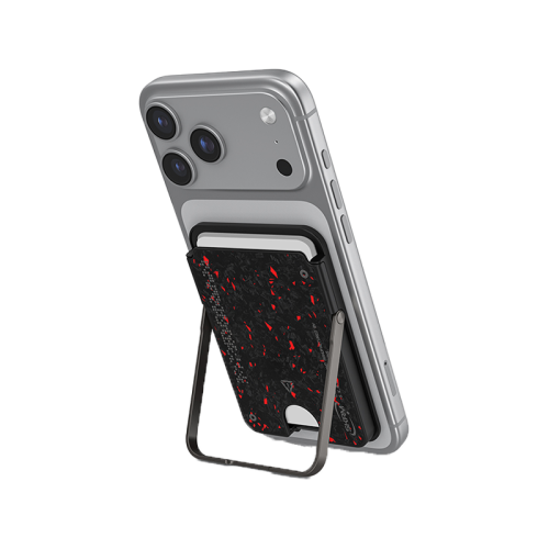 Built with VEKTOR's forged carbon finish and signature red-grey speckled detailing, this magnetic cardholder features an integrated kickstand for portrait or landscape viewing, securely storing up to two cards with RFID protection.