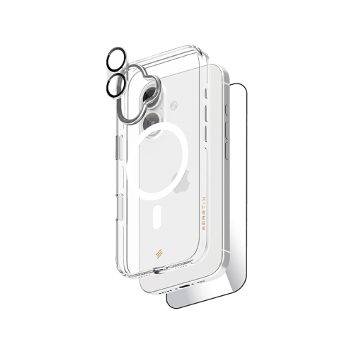 A sleek protection kit combining a magnetic clear case, tempered glass screen protector, and camera lens shield. Designed for full-body defense without compromising style or clarity—ideal for users who want minimalist protection with maximum coverage.