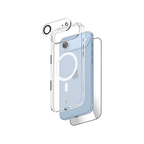 A sleek protection kit combining a magnetic clear case, tempered glass screen protector, and camera lens shield. Designed for full-body defense without compromising style or clarity—ideal for users who want minimalist protection with maximum coverage.