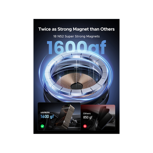 The UGREEN Magnetic Car Wireless Charger 15W - W708 offers a seamless charging experience designed for modern vehicles. Equipped with strong magnetic alignment, it securely holds your smartphone in place, ensuring stable and efficient wireless charging up to 15W. Its fast charging capability reduces downtime, allowing you to keep your device powered during drives without fumbling with cables. The charger’s sleek design integrates smoothly with your car’s interior, while its compatibility with a wide range of Qi-enabled devices makes it a versatile accessory for any driver. Enhance your driving convenience with reliable, hands-free charging.