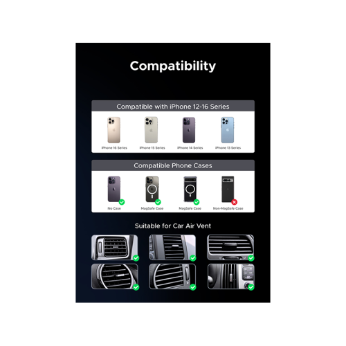 - Designed for iPhone Series: The MagSafe wireless car charger is designed for iPhone 16/16 Pro Max/iPhone 15/iPhone 15 Plus/15 Pro/15 Pro Max/14/14 Pro/14 Plus/14 Pro Max/13/13 Pro/13 Pro Max/13 Mini/12 Pro/12 Pro Max/12 Compatible with Mini etc. For better comfort, make sure to use Apple or Apple's certified MagSafe phone case when using a phone case