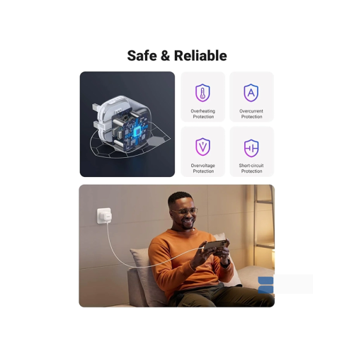 The UGREEN USB-C Fast Charger 40W (model CD243- White) with a folding foot is designed for efficient and convenient charging. Delivering up to 40 watts of power, it rapidly charges compatible devices, including smartphones, tablets, and laptops. Its compact design with a foldable plug makes it highly portable and ideal for travel or daily use. The charger incorporates advanced safety features to protect against overcurrent, overheating, and short circuits, ensuring reliable and secure performance. Compatible with UK power outlets, this charger offers a practical solution for fast, safe, and convenient charging needs.
