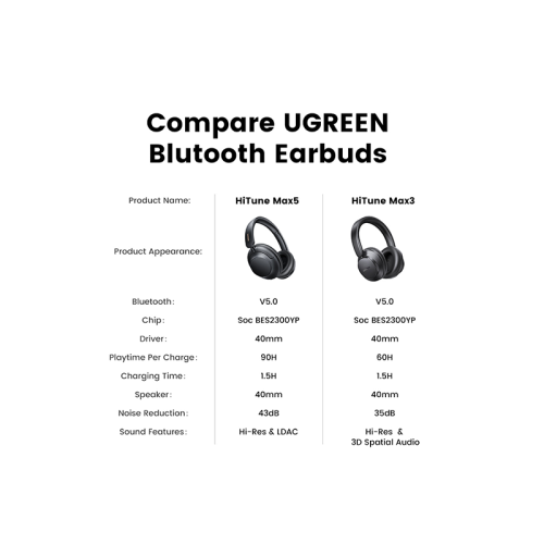 - Hi-Res Certification: Certified by Hi-Res (wired & wireless), UGREEN HiTune Max 5 Bluetooth headphones provide higher resolution rates and clearer sound. UGREEN displays the ultimate music quality, allowing you to feel the atmosphere of live shows.