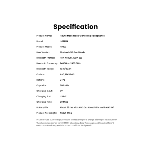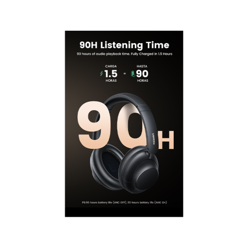 - 90 Hours Playtime, Fast Charging: UGREEN wireless headphones deliver up to 90 hours of playtime on a single charge. A 5-minute fast charge gives up to 9 hours of playtime. It takes 1.5 hours to charge the headphones from 0% to full.
