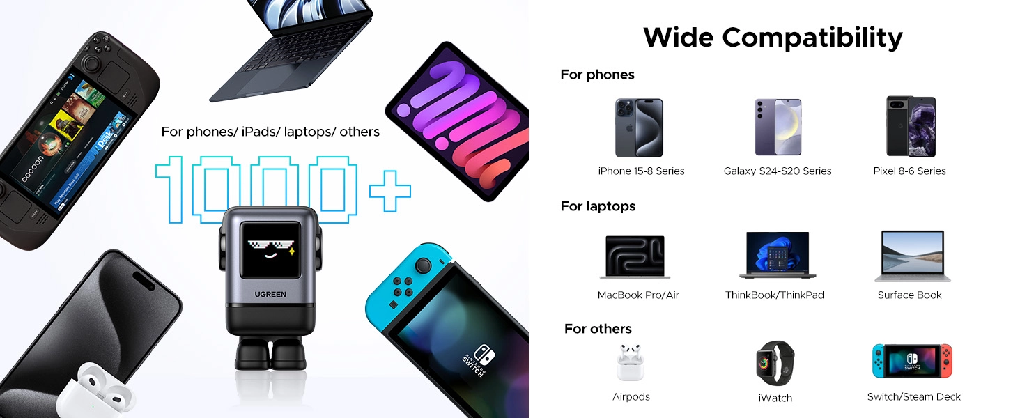 - Broad Compatibility: Supports iPhone 8–16, Galaxy S10–S24, Pixel 6–8, MacBook, iPad, Apple Watch, AirPods, Steam Deck, and more.