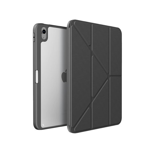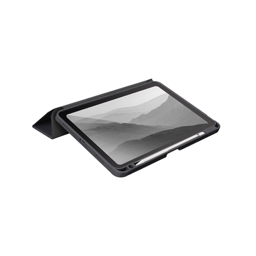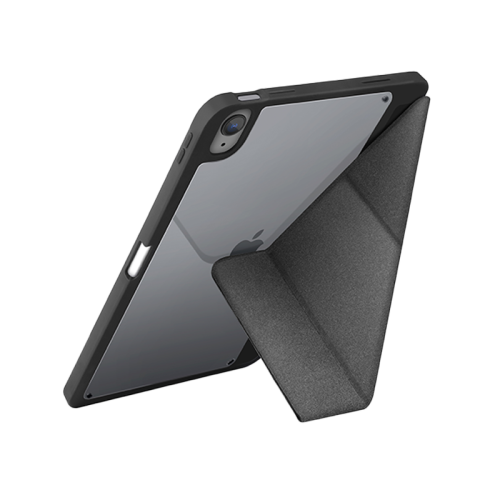 The Uniq Moven Case for iPad Air 10.9" (2022) - Charcoal Grey offers ultra-slim and lightweight design, 2H scratch-resistant clear back, built-in Apple Pencil holder, foldable stand for hands-free viewing, and fortified ShockArmor™ bumper for enhanced protection.