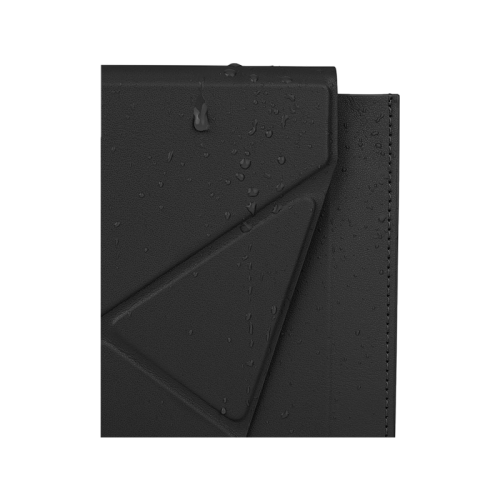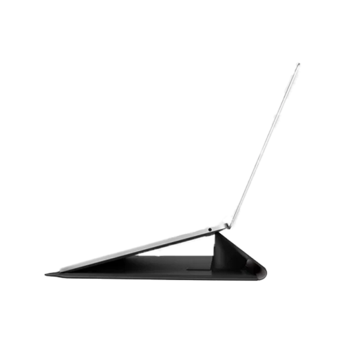 The Uniq Oslo Laptop Sleeve With Foldable Stand (Up to 14") - Jet Black offers splash-resistant vegan leather exterior, inner microfibre lining, magnetic foldable stand for a 25° angle, and compact design for portability.