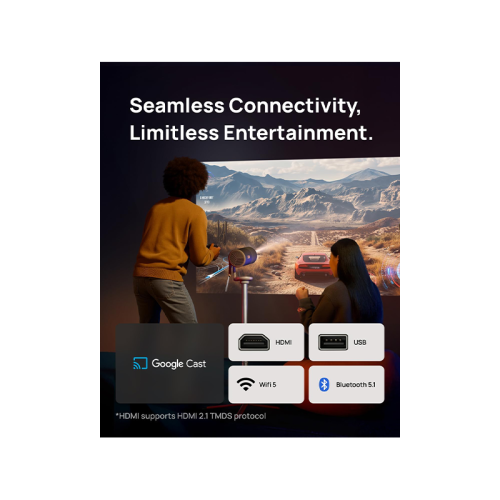 Stream the latest shows and blockbuster movies in sharp 1080P with 450 ISO Lumens brightness. Access 10,000+ apps and 800+ free channels on Google TV, with Netflix already built in. Just turn it on—no setup needed.