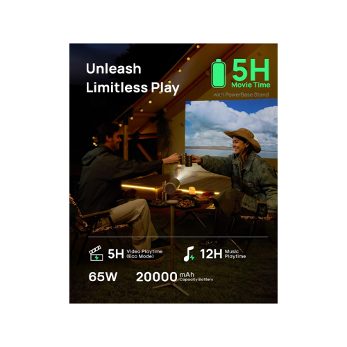 Enjoy up to 2.5 hours of built-in playtime, or double it to 5 hours with the included PowerBase Stand. Perfect for camping nights, backyard parties, or long trips—your big-screen entertainment never has to pause.