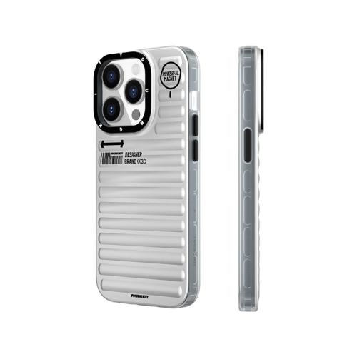 The Youngkit True Color Luggage - Inspired MagSafe Case for iPhone 16 Pro - Silver is a stylish and protective case designed to resemble luggage. It features MagSafe compatibility, shock-absorbing edges, and a sleek Silver finish, offering both practicality and a unique look for your iPhone 16 Pro.