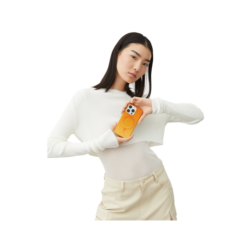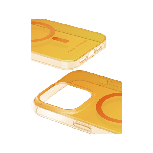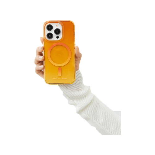 The iDeal of Sweden Clear MagSafe Case for iPhone 15 Pro - Orange Spritz is a stylish and durable protective case made from recycled materials. It features a sleek Orange Spritz tint, a slim profile, raised edges for camera and screen protection, and is MagSafe-compatible, providing both aesthetic appeal and eco-friendliness.