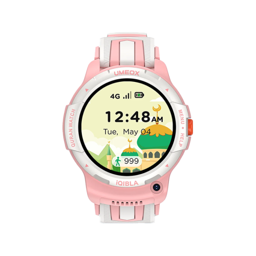 The iQibla Qwatch Kids Smart Watch - Pink is a versatile and educational smartwatch designed for children. It offers features like prayer and wudu guidance, an SOS button for emergencies, challenges for engagement, a "Shake Hands" feature for making friends, and 4G video calls for staying connected with family.