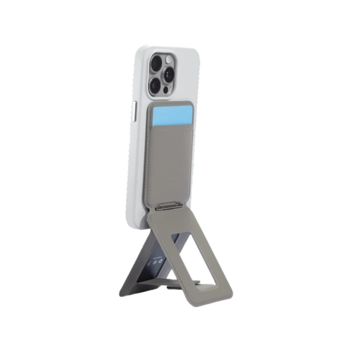 The Moft MagSafe Snap Invisible Tripod Phone Stand - Grey is a versatile accessory that combines a phone stand and a tripod. It features strong magnetic attachment for easy snap-on and removal, MOVAS™ vegan leather, and an adjustable angle for convenient viewing and photography.