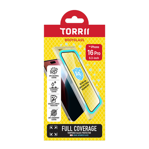 The Torrii BodyGlass Full Coverage Clear Screen Protector for iPhone 16 Pro offers full screen coverage, 9H hardness, anti-glare properties, smudge resistance, and easy installation.
