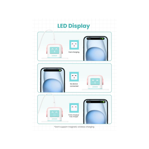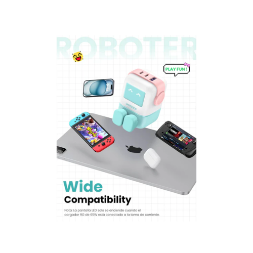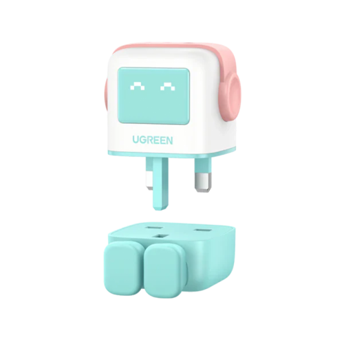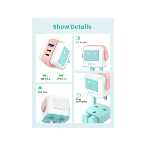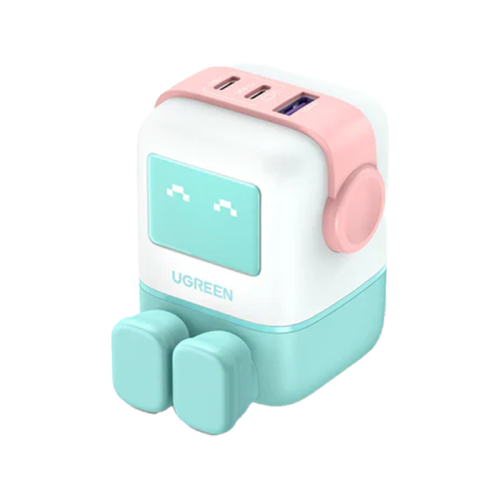 The Ugreen Nexode 2-Port USB-C and 1-Port USB-A 65W GaN Wall Charger With LED Display - Pink is a compact and efficient charger with two USB-C ports and one USB-A port, supporting fast charging for multiple devices simultaneously. It features GaN technology for a smaller size, intelligent power distribution, and a LED display for easy monitoring.